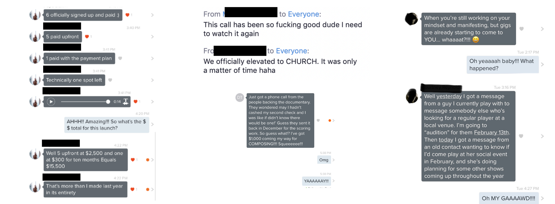 It's time to make more money in music. We'll launch a money making offer (or two) while ditching self-doubt around selling and promoting. We'll work on sales mindset + strategy so you no longer feel uncomfortable promoting your music, patreon, or coaching programs, you handle DMs & emails like a CHAMP, close leads, and charge prices that feel GOOD to you (and your bank account).Â
